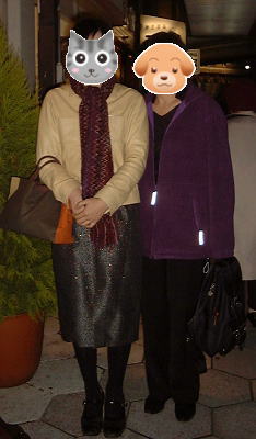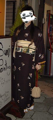 | さてさて、話が思いっきり逸れてしまいました。この着物姿の5名は、みんなネットで知り合った同士けろ。 左の写真の「パンダ会長」は、やはり「若菜の会」という着物好きの集まりの会長様でございます。Yahoo掲示板で「お食事会したいですね」というトピの、トピ主様であらせられ、かえるもそこにお邪魔してお知り合いになりました。 パンダ会長とは先に「若菜の会」にて、お会いしており、今回が2回目のご対面・・・。黒地にかわいいうさぎさんの小紋。半衿はなんとクリスマス柄。黒地の着物にとても良く似合ってましたよ〜。帯もナイスです。 |