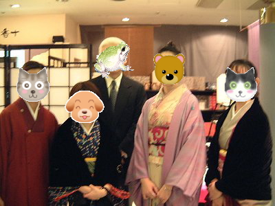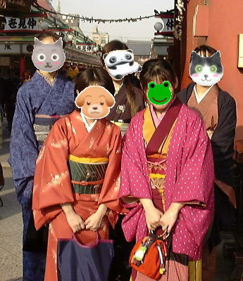 記念すべき、第1回かえる友の会「浅草喰い倒れツアー」の報告けろ。 参加者合計7名と、初回にしては上出来な集まり具合だったけろよ。参加して下さった皆さん、ホントにありがとう〜。とっても楽しかったね。 左の写真は着物姿の5名での記念写真です。まぁ、いろんな動物さんが・・・。(笑) |