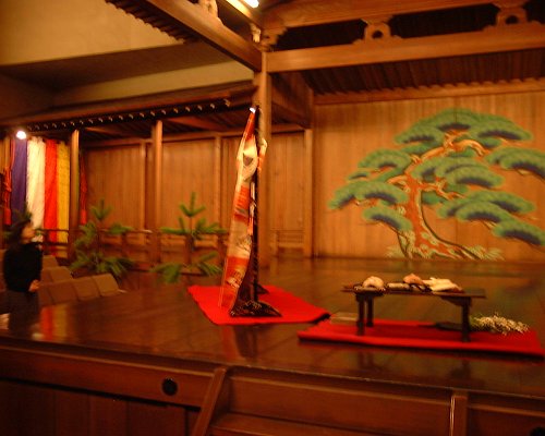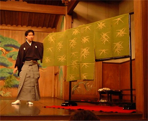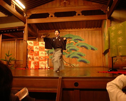 | かえるはまるで初心者・鑑賞経験無しなのですが、ご一緒したちよかさん、ネリーさんは経験済みだそう。初めて足を踏み入れる能楽堂、ドキドキけろでした。能楽堂に入り、皆さんが席に着くと、まず写真のように少しだけ披露して下さいました。声がすごく通るのでビックリ!特別なボイストレーニングをしてらっしゃるのでしょうか? | |