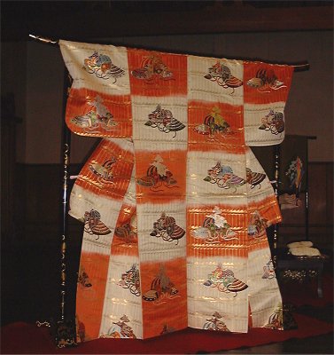 | これは装束についての説明をして下さっているところ。袖がすご〜く長いんですね。色がとてもステキです。 | |