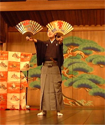 | これは扇についての説明をして下さっているところ。扇にも2種類あるんですって。初めて知ったかえる・・・。そして、その扇の図柄が、役によって決まっているそうです。写真ではよくわからないかもしれませんが、向かって右の海にお日様は、太陽が沈むところ、左が松に朝日だそうです。同じ太陽の図柄でも、正反対の意味を持っているんだって。 | |