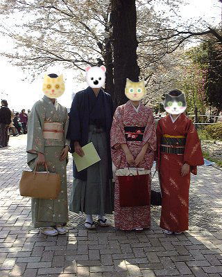 | あつさん、りばおちゃんとそのお友達のあいおいさん、そしてあっちゃんです。 あつさんの羽織袴姿、カッコ良かったですけろ〜。初めての「着物でお出かけ」だったとは思えません!すご〜い。殿方のお着物姿、いいですね〜。 あっちゃんはいつもかわいいです。(笑)桜かな?お花模様の小紋がとてもお似合い。 |