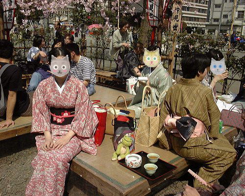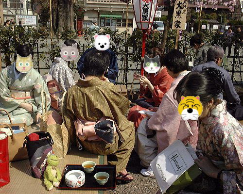 | 浅草で開催された、「隅田川園遊会・桜まつりでスタンプラリー」にみんなで参加しましたけろ〜。着物姿であれば、誰でも参加出来、豪華景品の当たる抽選会も。特賞はロサンゼルス5日間!「当てるぞ〜!」と、かえるはやる気まんまん。(笑)なのに、出がけに人が来たり、電話が掛かって来たりしたせいで、かえるはすっかり遅刻してしまいました。お待たせした皆さん、本当にすみませんでした。 ちょうど1週間前のお天気がすごいことになったので、「雨降らないといいね〜」なんて言っていたら、すごいいいお天気でした。暑いぐらいで・・・。抽選会がかなり長時間で(1時間半ぐらい?)、強い日差しの下にずっと立ちっぱなしだったので、くたびれたけろ〜。そこで時間を費やしたせいで、今回はまるで喰い倒れられなかったし・・・。(笑)ま、今回はスタンプラリーがメインということで、仕方無いけろですね。 さて、そのお目当ての抽選会、 あつさんが缶ビール6本、かえるが風呂敷をゲットしただけで、豪華景品を誰もゲットすることが出来ませんでしたが、来年はがんばるぞ〜。(笑)う〜ん、いっそ雨でも降ってくれた方が、それもかなりの悪天候とか(?!)の方が、参加者が減るから当たりやすいのかもね〜。でもさ、洋服の人もいたけど、いいの〜?(笑) でも、ホントに着物姿だらけで、こんなにたくさんの着物姿を見ることって滅多に無いだろうから、それを見られただけでも良かったですね。ホントこういうイベント、たくさんあったら楽しいですね。まっ黄色に赤の絣柄の女物着ていたおじさん、かわいかったよね!なんかこう、ホントに着物が好きで、楽しんで着ている、着こなしている・・・っていう方みると、すごく感動しちゃいます。 ご参加下さったみんなも、それぞれ個性のある着こなしで、「着物」って一口に言っても、奥がホント深いけろ。みんなの着こなしを参考にして、これからもどんどんおしゃれを研究したいと思いましたけろ〜。 参加して下さった皆さん、ホントにありがとうございました〜。また、今回は都合が合わなかったけど、楽しそうね〜と思った皆さんも、ぜひまたの企画にご参加下さいけろ〜。 |