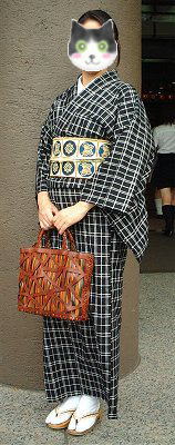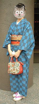 にゃんこさん、涼しげな絣ですね。写真じゃよくわからないけど、「にゃんこ柄」の鼻緒だ! |