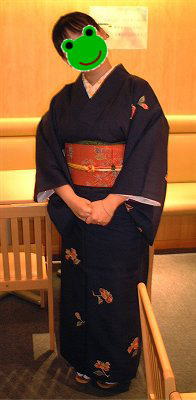 わっ!!ずんぐりむっくりなかえる。(笑)三頭身じゃないけろか。紺地に椿かな?、と思われるお花を染めた紬です。 |