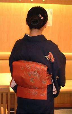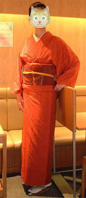 | 橙色の、紬地の帯を合わせました。小さなかんざしもかわいいでしょ〜。写真じゃ良くわからないけど、「かんざしonかんざし」になっているけろ。(笑) | ![]() |