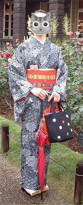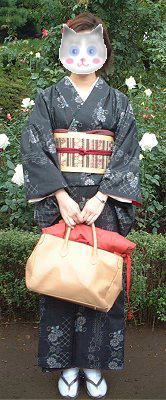 | りばおちゃん、黒地にお花柄の大島紬。これまた帯で、いろいろな雰囲気を楽しめそうです。今日のりばおちゃんは、やさしい感じ。こうして見ると、帯とバッグが合ってますね〜。 | ![]() |