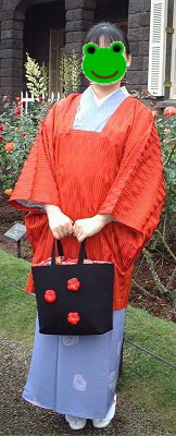 かえるは藤色がかった水色(?!)の洗える小紋です。色の表現って難しいですね〜。バッグは小鈴ちゃんの手作りなんです。かわいいでしょ〜。 |