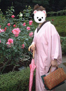 | 京子さんもステキなお着物だったのに、コート姿です。一番上の写真には、お着物写ってますね。半衿、ご自分で描かれた手描きです。京子さんは、友禅教室のお仲間でもあるのでした〜。ピンクのコートに、ピンクの傘、バラに合ってます。雨の日って、明るい色がいいですね! | ![]() |