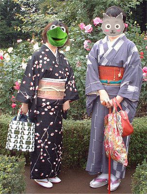 | にゃんこさんとけろけろさとおさん。にゃんこさんはグレーと言うより、ホントは「なんとか鼠」と言いたいお色の紬です。柔らかい感じで着やすそう・・・。けろけろさとおさんは、レトロな雰囲気の黒地の小紋です。黒地っていいですね〜。 | ![]() |