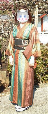 きちおさん、縞柄の紬です。お花柄も、ずっと縦に入っているのです。スッキリ、かっこよく着こなしてますけろ〜。日差しが強過ぎたのか、白っぽく光ってしまい、着物本来の色が出ませんでした。 |