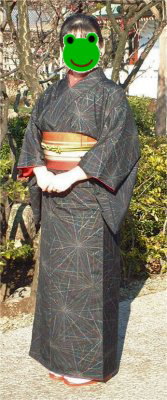 | かえるは黒地の紬です。日の当たるとこで見ると、緑色っぽく見えますね〜。蜘蛛の巣みたいな模様が、いろんな色で織り込まれています。帯は博多の半幅でした〜。 | ![]() |