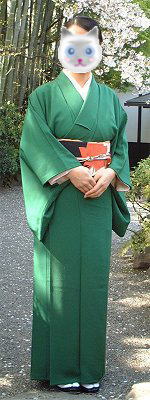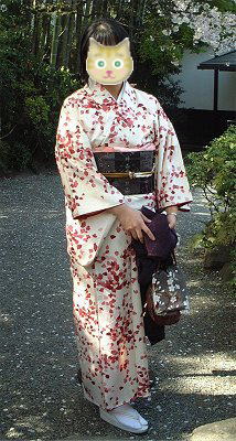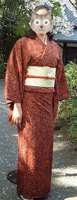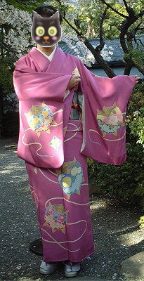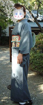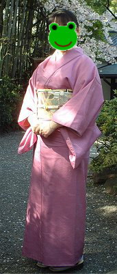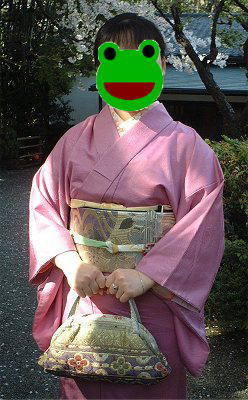 | かえるは色無地ですが、う〜む、これも何色と言えばいいのでしょうか。ローズピンク?赤みがかったラベンダー色?和名だと、赤みがかった菫色が近いのかなぁ。色の表現って、難しいけろね〜。勉強しなくちゃ!桜柄の袋帯を締めています。 | ![]() |