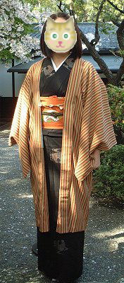 小木さん、縞柄の長羽織、かっこいいですけろ〜。お着物は黒地の大島紬。あとで後ろ姿の画像が出て来ますが、帯もステキなんですよ〜。 |