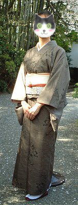 にゃんこさん、自作の訪問着です。友禅学院に通われているにゃんこさんは、白生地を自分の好きな色柄に染めたのでした。糸巻き柄、とてもかわいらしいですね〜。和裁もご自分でされるので、「染める・縫う」・・・あとは「織る」もやれば、無人島でも着物が着られる(ホントか?!)、にゃんこさんです。 |