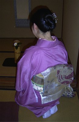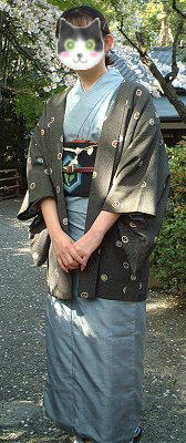 | wakakoさんは二回目のご参加でした。先日の問屋ツアーの時も、ステキな大島紬着てらしたのに、写真撮りはぐってしまって残念!皆さんにもお見せしたかったなぁ〜。今日は青竹色(合ってる?)の色無地。難しいお色、オシャレに着こなしてらっしゃいましたけろ。 | ![]() |